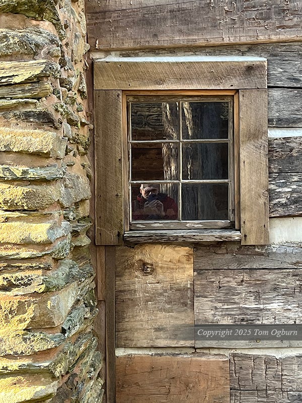 This cabin was built in 1861 from very large hand-hewn tulip-poplars, one of the toughest woods to work even when green. A small six-panel window reveals nothing on the inside of the cabin, but reflects as a mirror that which is directly across from it, a large tree standing just 20 feet away. And in the lowest left pane the haint form of a very cold photographer trying to diminish himself unsuccessfully.